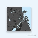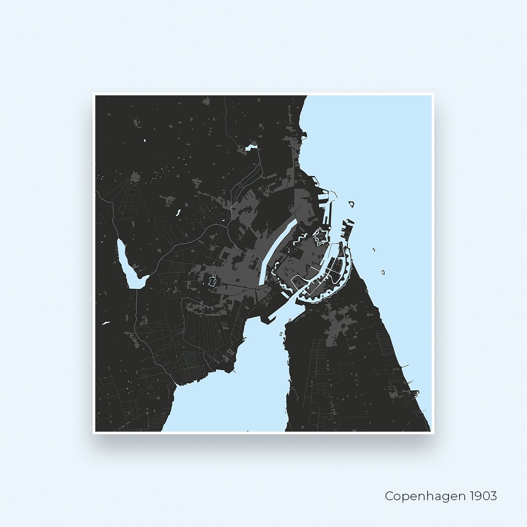 Three maps of Copenhagen showing the built-up area (grey) and surrounding landscape in 1830, 1903 and 2016.